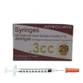 - 100 Advocate Insulin Syringes 29G - 3/10cc Syringes (1/2")