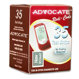 The Advocate ready-code glucose test strips allow you to easily and accurately test your blood glucose level. Redi-Code Plus test strips require small blood samples (0.7 micoliters) and use capillary action to pull? blood onto the test strip for blood easy application. Visual confirmation allows you to instantly know if you have applied the correct amount of blood to the test strip. (less wasted strips) Includes 35 Redi-Code Plus test strips.